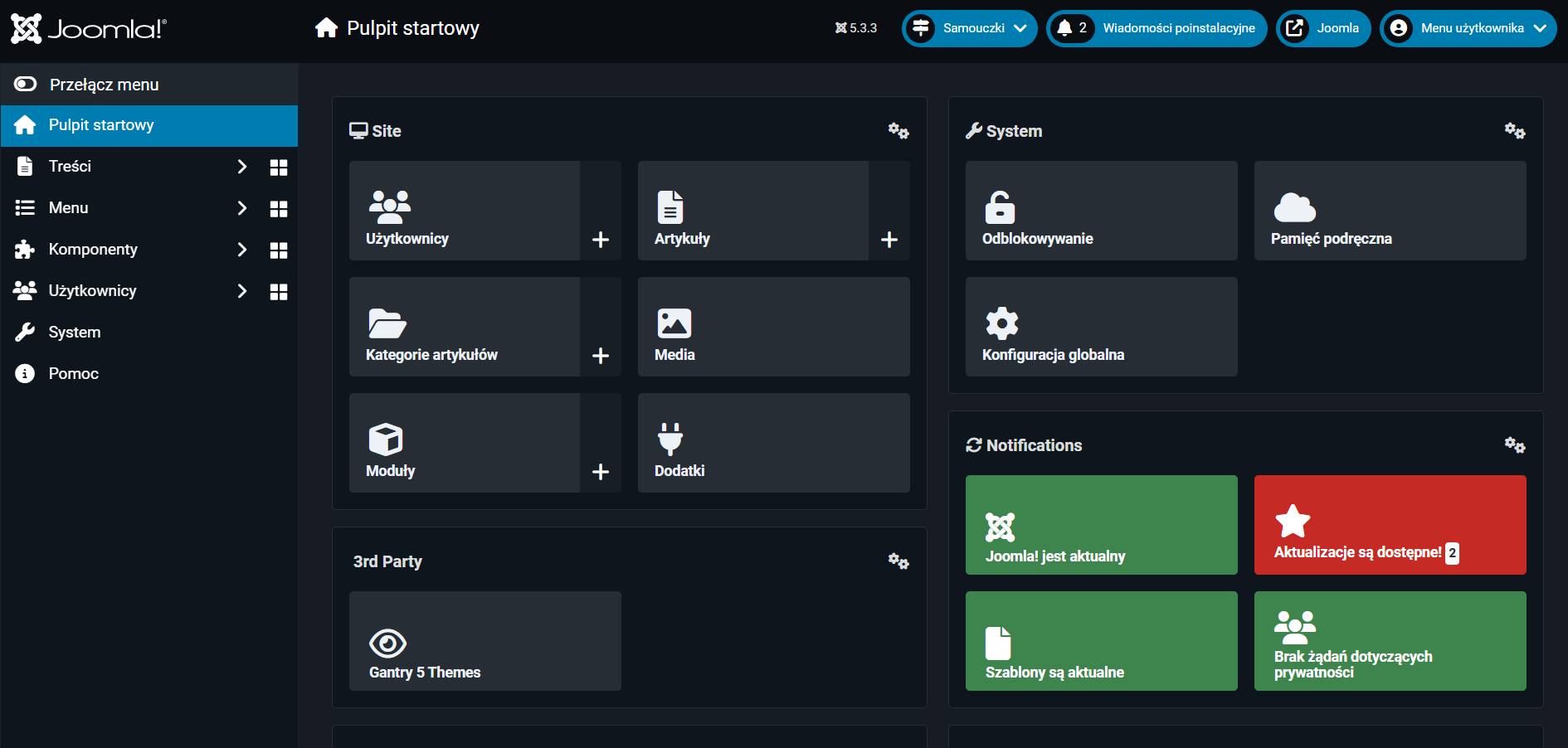 Zaplecze Joomli to panel administracyjny, w którym zarządza się całą stroną i jej treściami. Po zalogowaniu użytkownik trafia do pulpitu z czytelnym menu bocznym oraz skrótami do najważniejszych funkcji. W zapleczu można dodawać i edytować artykuły, tworzyć kategorie, zarządzać użytkownikami, modułami i rozszerzeniami, a także konfigurować wygląd witryny. Joomla oferuje duże możliwości personalizacji – każdy element strony można dopasować dzięki systemowi modułów, które dają sporą elastyczność. Kokpit Joomli jest nieco bardziej rozbudowany niż w WordPressie, dlatego wymaga chwili nauki, ale zapewnia większą kontrolę nad szczegółami działania strony.