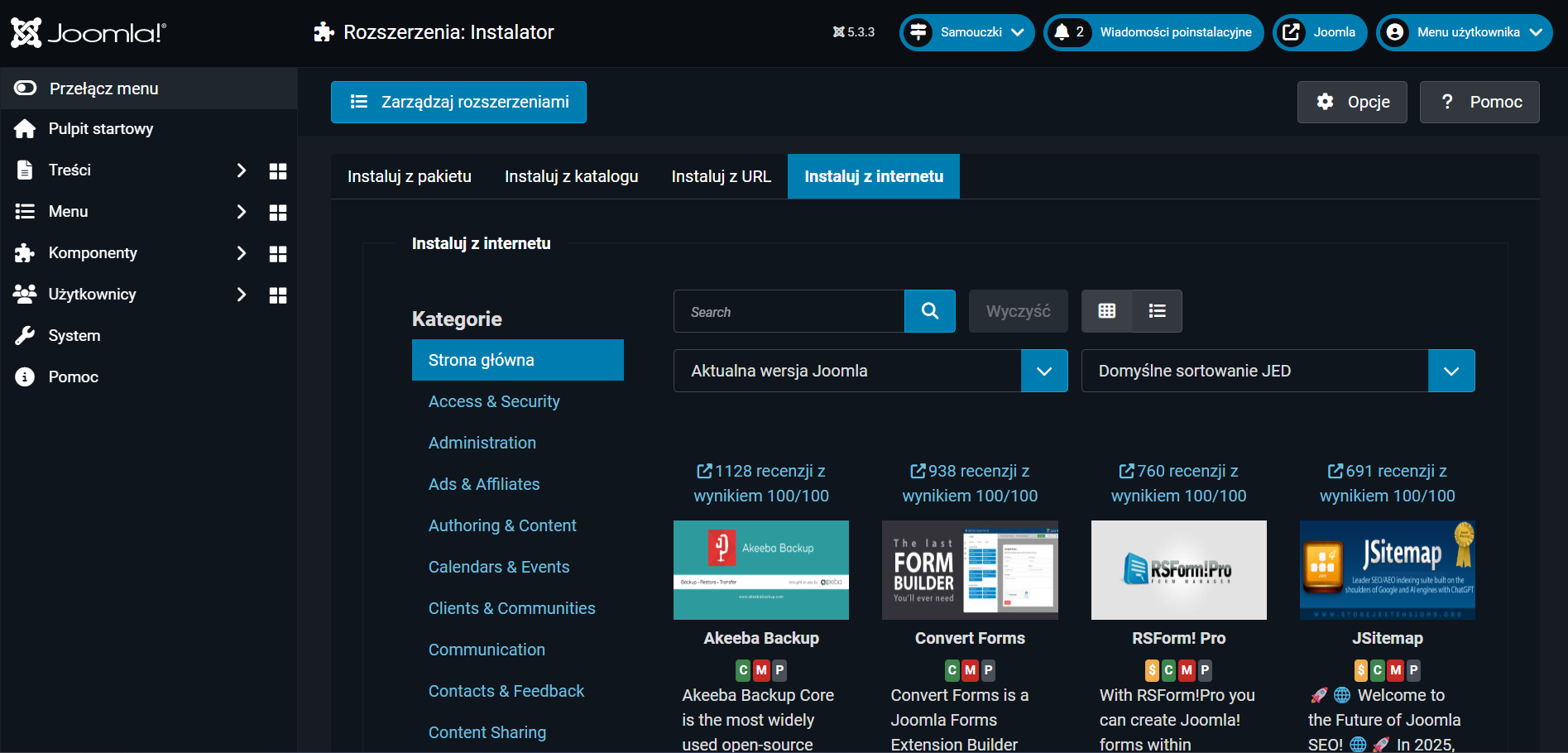 - Akeeba Backup – narzędzie do tworzenia i przywracania kopii zapasowych strony.